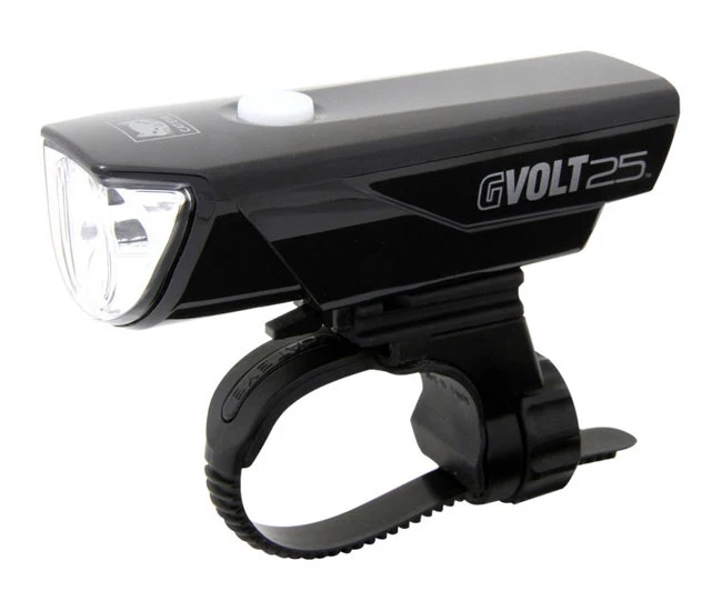 Die kleine ueber USB aufladbare Volt25 RC mit ihren 25 Lux hat zwei Leistungs-Modi: Hoch und Niedrig. Die leichte Frontleuchte ist super kompakt und im Nu von der Halterung geclipst und in die Tasche gesteckt. Sie kann sowohl mit den mitgelieferten NiMH-Akkus, als auch Alkaline-Batterien, nicht enthalten, betrieben werden, 2x Typ AA. Die smart gestaltete Reflektorform garantiert eine direkte Ausleuchtung. Die Volt25 RC – Designt fuer Urbane Abenteuer auf dem Rad.