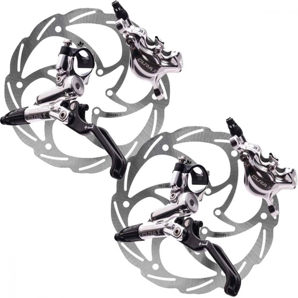 Die Formula Cura X Scheibenbremsen mit Carbon Bremshebel, 2 Kolben Bremssattel, die Discbbrakes fuer den Race, Marathon bis All Mountian Einsatz mit herrvorragender Bremspower und Standfestigkeit. Entwickelt ohne Kompromisse bei Performance, Power und Bremskraft Modulation.