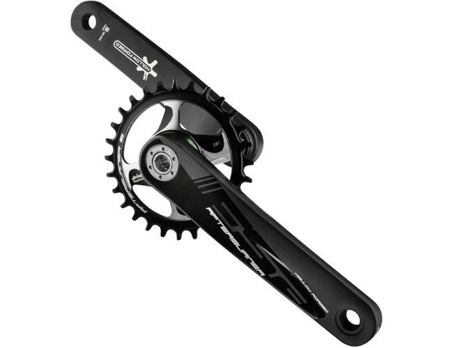 Von den Kurbelarmen, ueber den Spider bis hin zum Kettenblatt praktisch jedes Bauteil des 1×11 – fach Afterburner Kurbelsatzes wurde fuer eine noch bessere Leistung ueberarbeitet. Die schmal gehaltenen Kurbelarme werden hohl geschmiedet aus hochfestem 6066/T6 Aluminium und auf eine 24 mm ChroMoly – Stahl Welle geklemmt. Dies ermoeglicht selbst im haertesten Traileinsatz hoechste Festigkeit. Die Kettenblattschrauben bestehen ebenfalls aus ChroMoly – Stahl, des Weiteren kann dank des ausgekluegelten Designs des Kurbelarms der Nicht – Antriebsseite auf eine Pinchbolt – Konstruktion verzichtet werden.