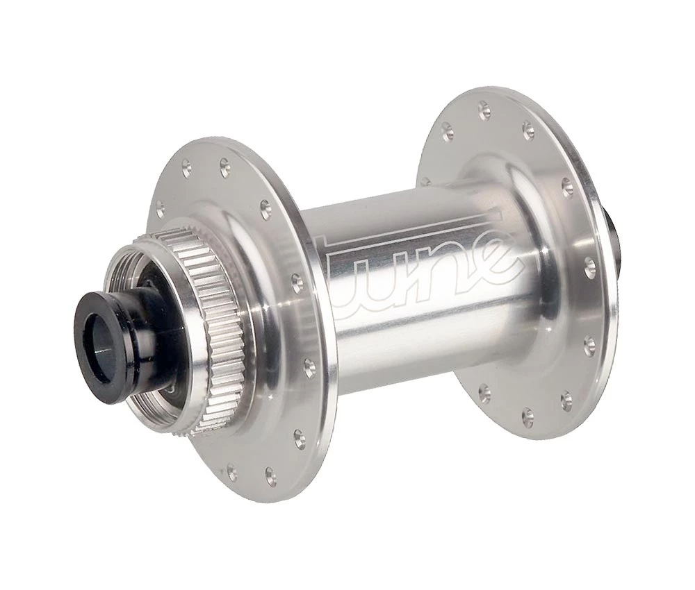 Die bewaehrte Vorderradnabe fuer Scheibenbremsen von Tune. Sehr stabile Nabe mit einzigartiger Konstruktion, die dafuer sorgt, dass durch einstellbares Spiel keine Lagerverklemmung, auch bei haertester Einspannung, mehr moeglich ist. Die King besteht aus einem einteiligen, CNC-gedrehten Aluminiumkoerper und 2 Rillenkugellagern.
