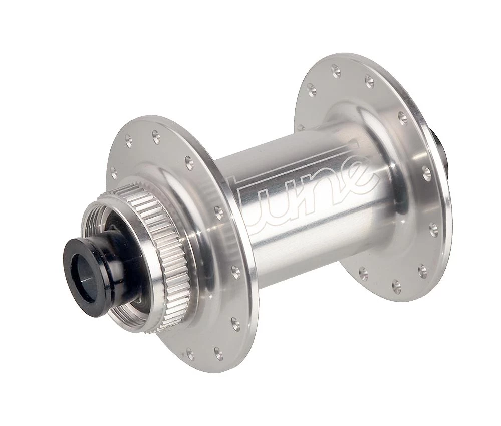 Die bewaehrte Vorderradnabe fuer Scheibenbremsen von Tune. Sehr stabile Nabe mit einzigartiger Konstruktion, die dafuer sorgt, dass durch einstellbares Spiel keine Lagerverklemmung, auch bei haertester Einspannung, mehr moeglich ist. Die King besteht aus einem einteiligen, CNC-gedrehten Aluminiumkoerper und 2 Rillenkugellagern. Tune verwendet Sonderlager, welche im Handel so nicht erhaeltlich sind!